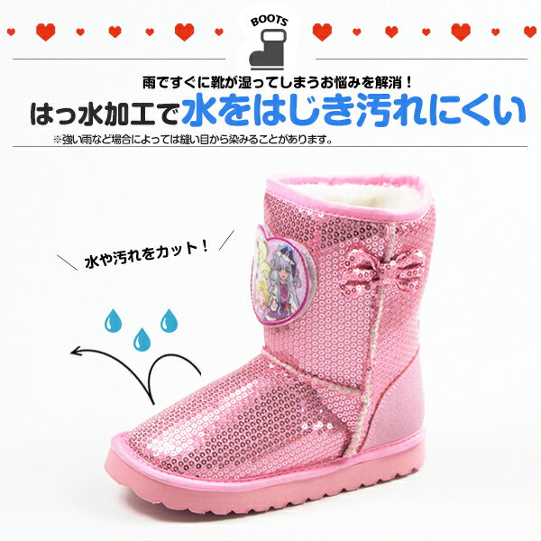 【送料無料】 ブーツ 子供 キッズ ジュニア 16.0-18.0cm 靴 女の子 フェイクムートン プリキュア 5103 ピンク シルバー ブラック キュアエール キュアアンジュ キュアエトワール キュアアムール キュアマシェリ はぐたん 雨 冬 撥水 リボン 通園 保育園 リボン キラキラの商品について ・大人気キャラクターといつでも一緒!お出かけが楽しくなります♪